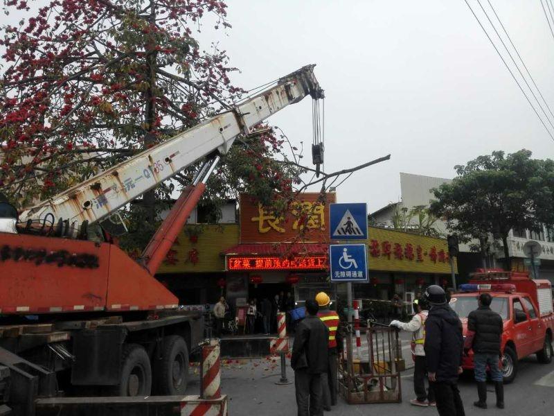 下午4点钟左右,执法人员按照中队部署,对穗盐西路沿线进行巡查,在巡至与虎榜市场路段交界处时,发现有几个市民站在路边对着一棵大木棉树指指点点。一看,原来是大树的枝桠断了一大节,刚好就挂在树枝上,摇摇欲坠。而树下仍有市民和车辆来来往往,如树枝刚好掉落,后果不堪设想。两名执法人员即刻赶过去,指引市民绕路行驶,避开大树,并联系河东社区、河东城管工作站和施工队赶到现场协助排除隐患。待施工队开着吊车到达现场后,执法人员便同社区工作人员一起疏散周边人员做好警戒,保证在清理断树枝的过程中不出现意外伤害。在施工队的有序配合下,很快树枝便被安全清理。隐患排除,道路恢复正常通行,于是执法人员继续投入到巡查工作中。
