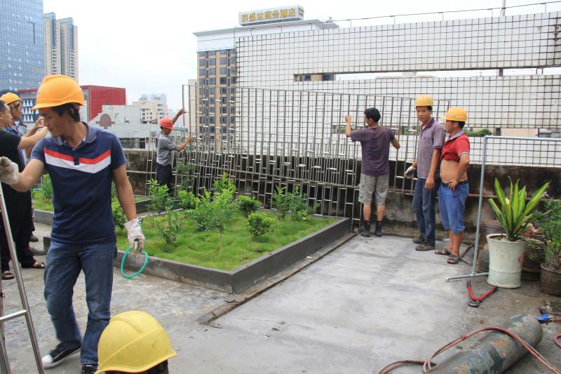 当执法人员一行到达天台时,现场已有50多平米的公用面积铺设了绿皮,栽种了绿化盆栽,此外业主还设置了铁栏杆,围蔽了楼顶天台一半的公用面积,且现场围蔽的范围还有部分未施工意图进行其他改建行为,为遏制萌芽违建,灯湖中队决定快速处置拆除铁栏。施工前,该业主到天台“申诉”,认为其安置的铁栏并未上锁,并不侵占集体利益,也反映由于小区天台年久失修,出现天花渗水现象,便对天台水泥硬底化,栽种花卉,出于天台安全加装了铁栏。