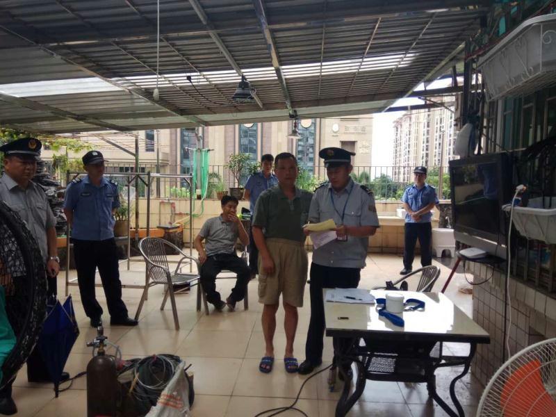 据调查了解,该“电梯”是悦海楼二楼住户私人建设的。业主把二楼阳台的围墙拆除一部分,在外面加建一个“电梯”,主要为了方便自己搬运东西。执法人员到场时,业主和施工人员正在对“电梯”进行调试安装。当执法人员要求业主出示相关加建“电梯”的审批文件和要求施工人员出示安装“电梯”的资质证明时,他们均无法提供。对此,执法人员当场要求施工人员停止施工,暂扣施工人员焊机、电钻等施工工具;向业主发出《责令限期改正通知书》和《询问调查通知书》,要求业主到城管部门接受询问调查。