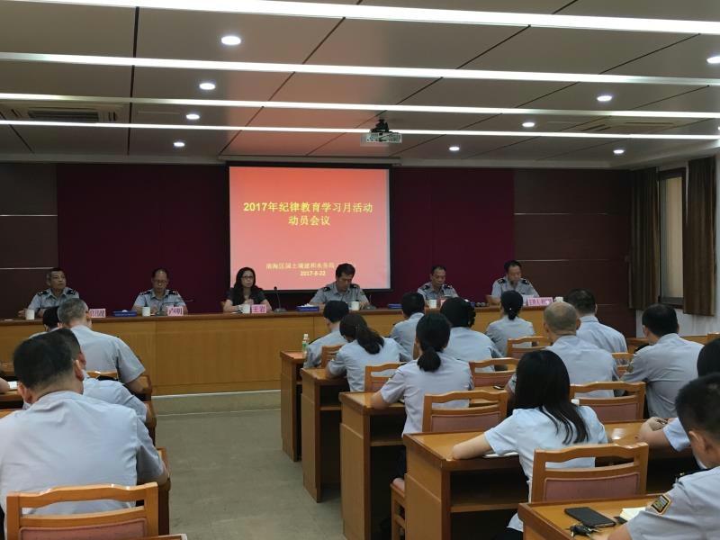 8月22日下午,区城管局召开2017年纪律教育学习动员会议,区纪委派驻城管局纪检组长王岩同志、区局领导班子、各基层城管局代表、机关全体人员参加会议。首先,杜炳添副局长解读《南海区国土城建和水务局(城管)2017年纪律教育学习月活动实施方案》,要求各科室、中心、基层城管局抓好纪律教育学习,履行监督责任,加强督促检查,定期通报情况,及时总结经验,推动纪律教育活动各项工作落实到位。二是王岩同志传达南海区领导干部纪律教育学习班暨“双集班”动员大会会议精神并通报了我区部分违法违纪案件,教育引导党员干部在任何岗位、任何地方、任何时候、任何情况下都要讲规矩、守纪律、敢担当,为南海的改革发展提供坚强有力的保障。三是植荣桢常务副局长就我局纪律教育学习月活动提出相关要求,强调我局党员干部要提高思想认识,看清当前反腐形势;珍惜当下,知足常乐;结合“两学一做”学习教育活动,加强学习,避免违法违纪行为。最后,全体人员观看了《走向牢狱的“规划”》、《权利失控之祸》两部案例纪录片,以反面典型为鉴,做到受警醒、知敬畏、守底线。
