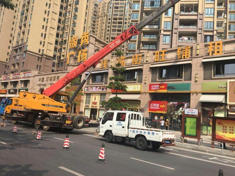 10月25日早上,桂城城市管理局灯湖中队执法人员带领施工人员首先对南海大道东侧中建领秀广场外立面的违规字牌进行拆除。由于字牌有一定高度和分散,需要使用吊机才能安全拆除。