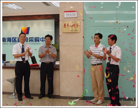 7月8日上午,我中心举行了简单而隆重的南海区“青年文明号”挂牌仪式,区政府办副主任黄奔、区团委书记梁耀斌等领导参加了仪式。我中心是全省第一家获得“青年文明号”称号的政府采购中心,而且仅用一个月的时间就申请成功,这是非常鲜见的。区团委梁书记在我中心挂牌仪式现场指出:“南海区政府采购中心创建‘青年文明号’领导重视、上下一心、目标突出;起点高、行动迅速、效果好。”“青年文明号”的争创成功,是一种荣誉,也是动力,它将鞭策我们以更高的标准、更好的服务和饱满的热情去履行政府采购工作。我们将再接再厉,争取年内获得市级“青年文明号”称号。