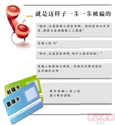 南海警方表示,近期全国各地均发生过不少类似的“医保卡”电话诈骗案例。南海警方最近一周便接到7宗该类报案。警方介绍,在这类型案件中,骗子冒充医保部门人员和公安人员以“医保卡购买违禁药品”“医保卡被锁”“卡被异地盗刷”等为由,实施诈骗。