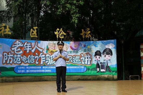 为进一步做好老年人权益保障工作,从根本上提高老年人防范电信诈骗的意识和能力,动员全社会共同参与营造老年人幸福晚年生活。经研究决定,佛山市公安局南海分局和南海民政局联合在十月至十一月期间开展老年人防范电信诈骗知识巡讲系列活动。10月20日,在桂城桂三社区举行了首场巡讲活动和启动仪式。